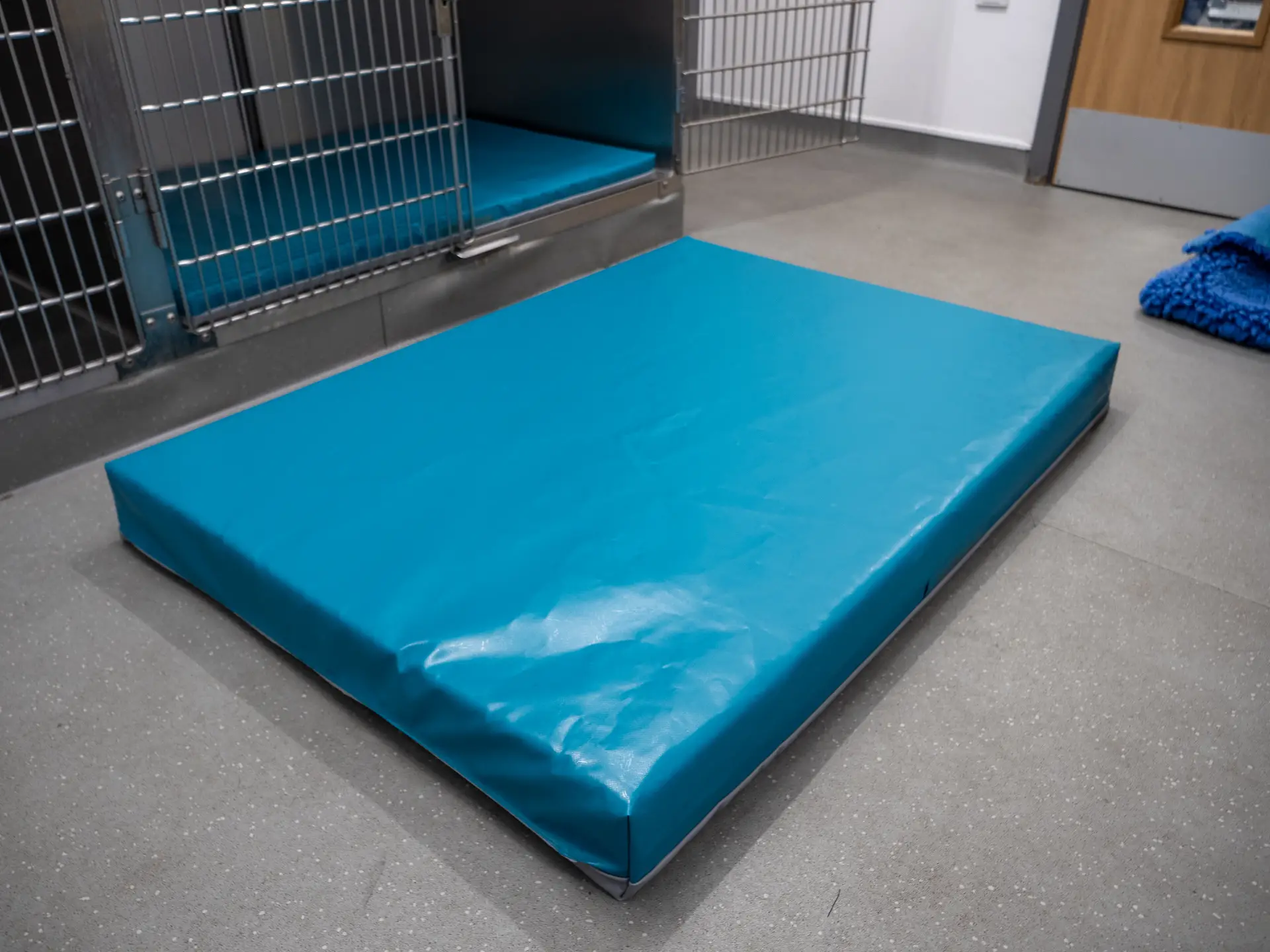 A dual-sided kennel mattress, designed to support patients who are likely to be recumbent for more than 24 hours. The grey recovery side provides memory foam cushioned pressure relief and support during recumbency and surgical recovery. For patients who are up and about, simply flip the mattress to use the extra-thick aqua-coloured active side, giving extra-durable comfort.